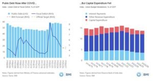 हालाँकि, घरेलू आर्थिक आकांक्षाएँ और बाहरी राजनीतिक वास्तविकताएँ यह संकेत देती हैं कि भारत को नए व्यय की आवश्यकता का सामना करना पड़ेगा। सरकार ने 2041 तक भारत को एक विकसित राष्ट्र बनाने का लक्ष्य निर्धारित किया है। यह दृष्टि—जिसे आमतौर पर विकसित भारत कहा जाता है—बुनियादी ढांचे में सार्वजनिक निवेश और लघु एवं मध्यम उद्यमों के समर्थन की मांग करेगी। दुर्भाग्य से, पिछले वित्तीय समेकन प्रयासों का एक दुष्प्रभाव यह रहा कि जीडीपी के अनुपात में पूंजीगत व्यय में कमी आई (ऊपर दिए गए दाहिने चार्ट देखें)।