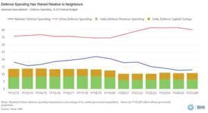 भारत के अधिक चुनौतीपूर्ण बाहरी सुरक्षा परिवेश से भी नए व्यय की आवश्यकताएँ उत्पन्न हो रही हैं। पिछले पाँच वर्षों के दौरान देश का चीन जनवादी गणराज्य और पाकिस्तान के साथ सशस्त्र टकराव हुआ है। इसी बीच, 2018–2020 के दौरान उल्लेखनीय गिरावट के बाद केंद्र सरकार के कुल व्यय में रक्षा खर्च का हिस्सा ठहरा हुआ है (नीचे दिए गए चार्ट देखें)। चीन के ऊँचे रक्षा व्यय स्तर और पाकिस्तान द्वारा हाल ही में अपने रक्षा बजट में वृद्धि के निर्णय को देखते हुए, नई दिल्ली को वित्त वर्ष 2026-27 में सुरक्षा पर अधिक खर्च करने पर विचार करना होगा।