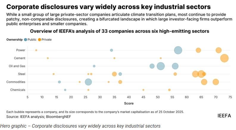IEEFA की रिपोर्ट भारत के कॉर्पोरेट क्षेत्र में संक्रमण योजना की प्रथाओं का विश्लेषण करती है, जिसमें छह उच्च-उत्सर्जन वाले क्षेत्रों—बिजली, इस्पात, सीमेंट, रसायन, कमोडिटीज़ तथा तेल और गैस—में कार्यरत 33 कंपनियों का व्यापक मूल्यांकन शामिल है।