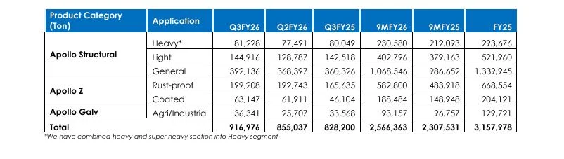 एपीएल अपोलो ट्यूब्स ने तीसरी तिमाही वित्त वर्ष 26 (Q3FY26) में 9.17 लाख टन की रिकॉर्ड बिक्री मात्रा दर्ज की