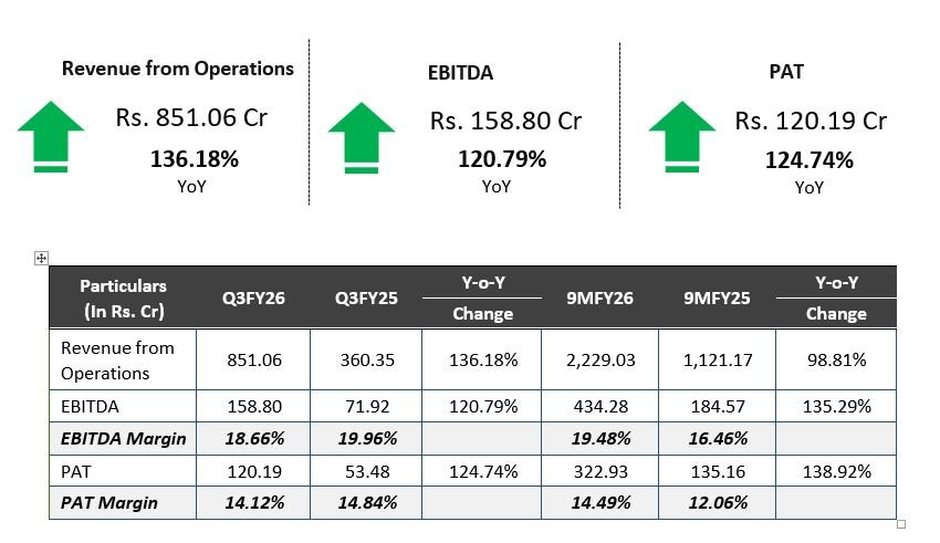 “हमें क्यू3 वित्त वर्ष 26 में 851.06 करोड़ रुपये के राजस्व की रिपोर्ट करते हुए खुशी हो रही है, जो क्यू3 वित्त वर्ष 25 में 360.35 करोड़ रुपये की तुलना में वर्ष-दर-वर्ष 136.18% की वृद्धि को दर्शाता है। इस प्रदर्शन के लिए हमारे मार्जिन हमारी निष्पादन उत्कृष्टता, वित्तीय अनुशासन और मजबूत परिचालन मॉडल को दर्शाते हैं।