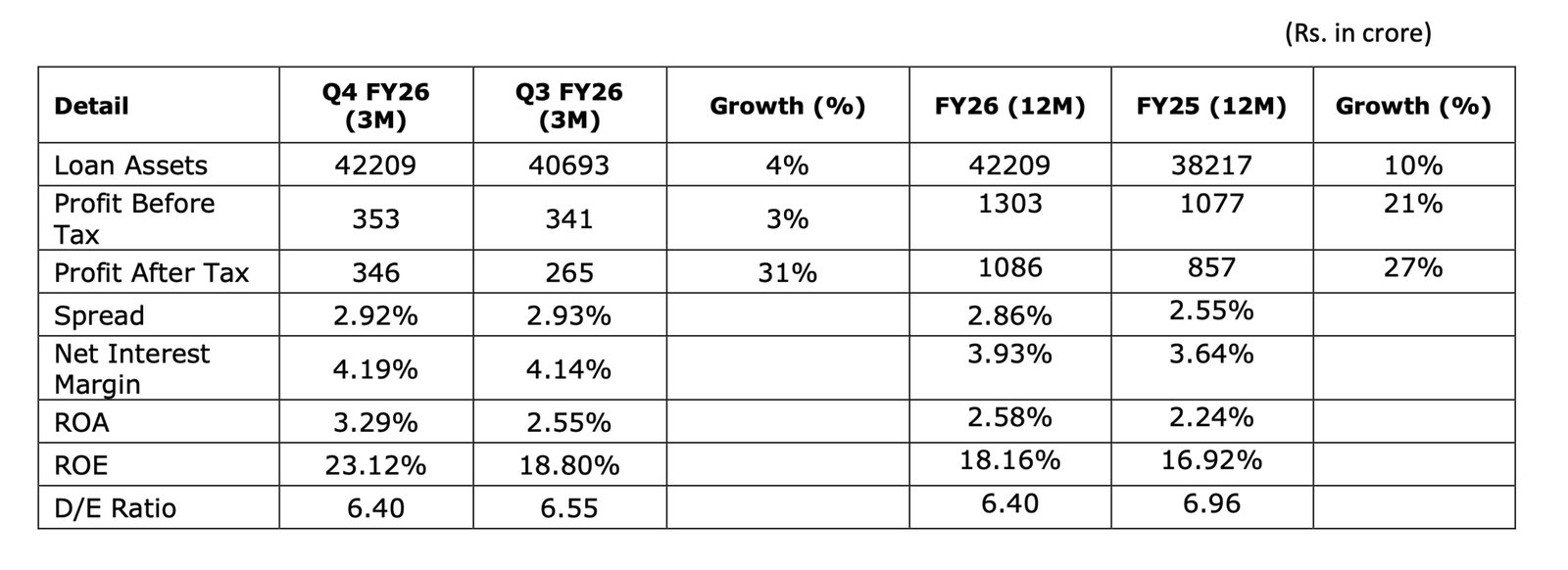 31 मार्च 2026 को समाप्त 12 महीनों में ऋण वितरण 10,531 करोड़ रुपये रहा, जबकि पिछले वित्त वर्ष की समान अवधि में यह 8,568 करोड़ रुपये था। इस प्रकार वर्ष-दर-वर्ष (YoY) 23 प्रतिशत की वृद्धि दर्ज की गई।