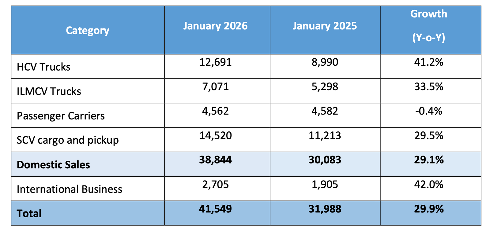 मुंबई: टाटा मोटर्स लिमिटेड की घरेलू और अंतरराष्ट्रीय बाजारों में जनवरी 2026 की बिक्री 41,549 पर रही, जबकि जनवरी 2025 में यह 31,988 थी। इस प्रकार साल-दर-साल आधार पर 29.9 प्रतिशत की वृद्धि दर्ज की गई।